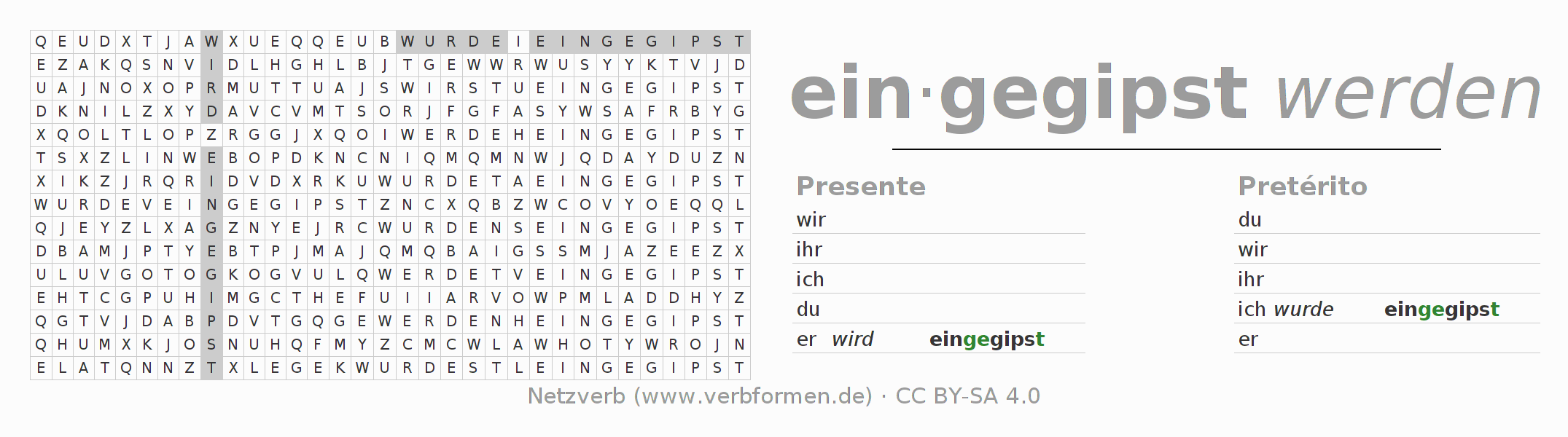 Guía: forma las construcciones correctas para el verbo eingipsen y encuéntralas en el acertijo. O también encuentra la conjugación de eingipsen en la sopa de letras y ordénala en la construcción verbal correcta. Las diéresis y el ß aparecen escritos como: ss (ß), oe (ö), ae (ä) y ue (ü).La solución se encuentra al final de la página.