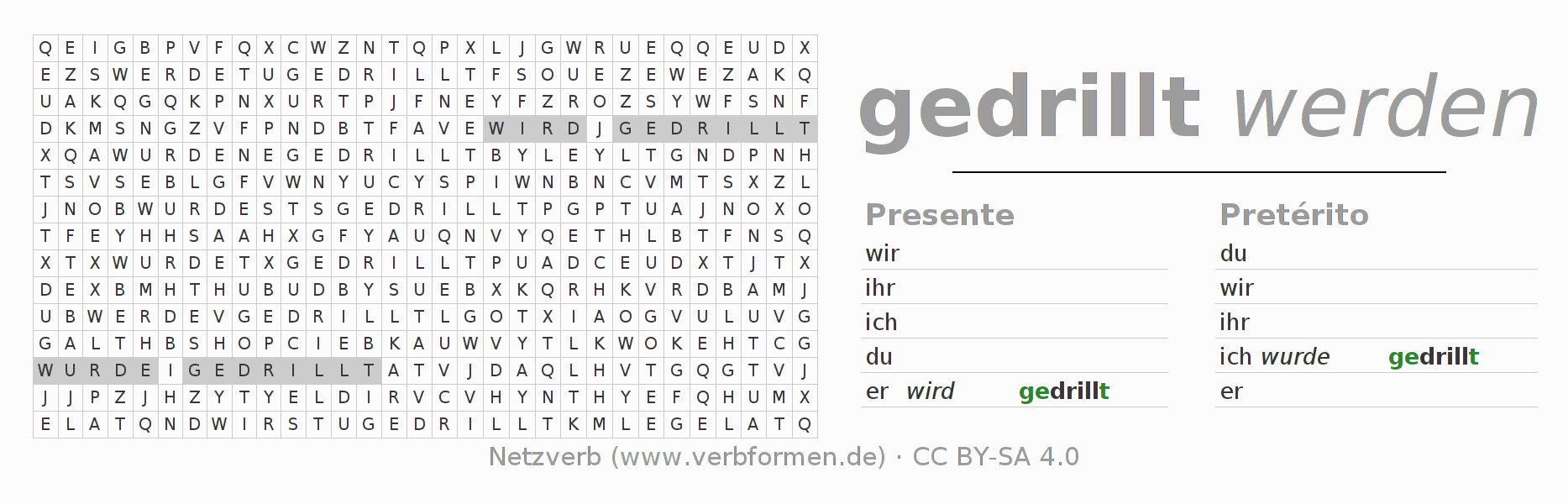 Guía: forma las construcciones correctas para el verbo drillen y encuéntralas en el acertijo. O también encuentra la conjugación de drillen en la sopa de letras y ordénala en la construcción verbal correcta. Las diéresis y el ß aparecen escritos como: ss (ß), oe (ö), ae (ä) y ue (ü).La solución se encuentra al final de la página.