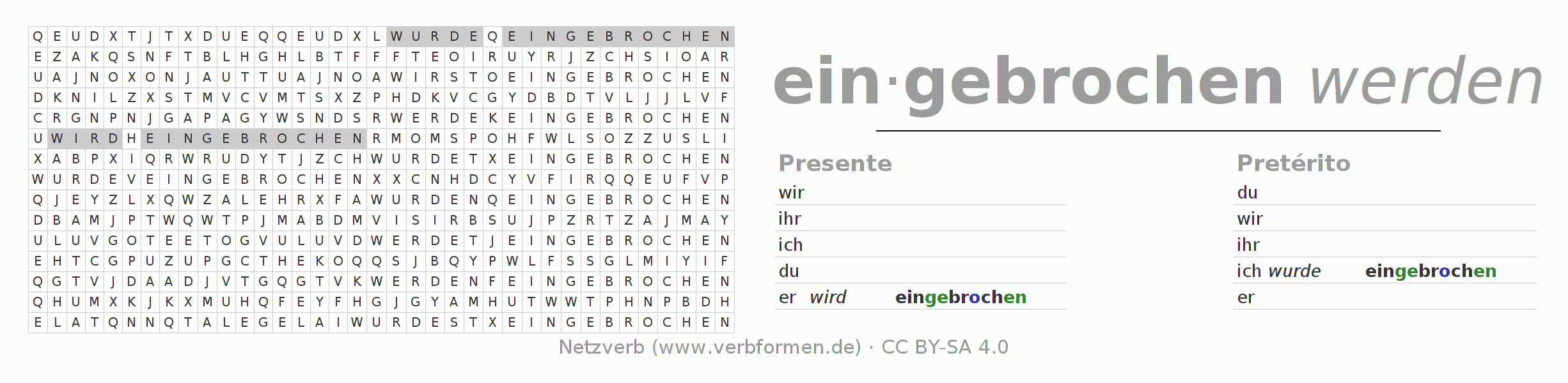 Guía: forma las construcciones correctas para el verbo einbrechen y encuéntralas en el acertijo. O también encuentra la conjugación de einbrechen en la sopa de letras y ordénala en la construcción verbal correcta. Las diéresis y el ß aparecen escritos como: ss (ß), oe (ö), ae (ä) y ue (ü).La solución se encuentra al final de la página.
