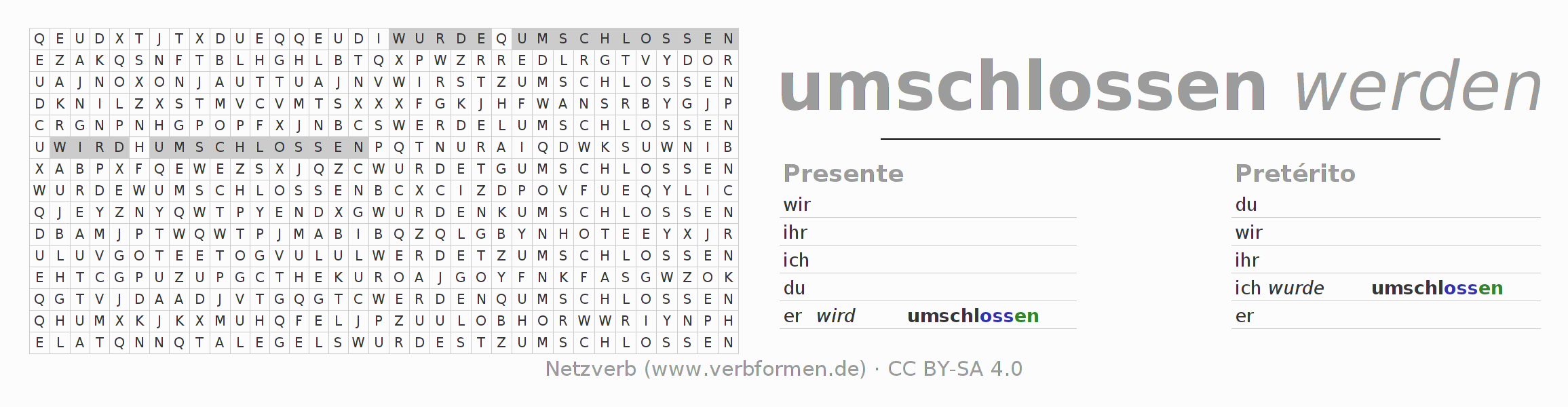 Guía: forma las construcciones correctas para el verbo umschließen y encuéntralas en el acertijo. O también encuentra la conjugación de umschließen en la sopa de letras y ordénala en la construcción verbal correcta. Las diéresis y el ß aparecen escritos como: ss (ß), oe (ö), ae (ä) y ue (ü).La solución se encuentra al final de la página.