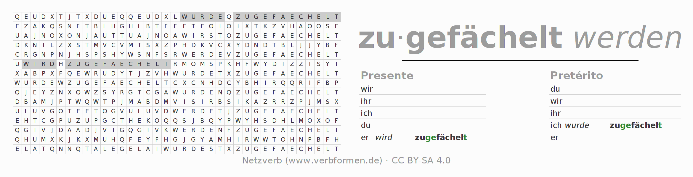 Con el juego de palabras cruzadas (Wortsuchrätsel o Suchsel) puedes aprender las conjugaciones alemanas. Tienes que armar cada una de las formas verbales para después encontrarlas dentro de una sopa de letras. También puedes proceder de forma contraria. Una vez que encuentras un verbo conjugado, tienes que descubrir a qué forma verbal pertenece. Para descargar e imprimir, puedes acceder por aquí a una versión en PDF-Versión o también como imagen. También hay muchas otras hojas de ejercicios para los verbos zufächeln. Todo el material de estudio es Open Educational Resources (OER), es decir, libre de licencias CC BY-SA 4.0 y puede ser descargado y utilizado de forma gratuita. En este link en la sección de ayuda encuentras más información Poner en práctica las sopas de letras en el aula y el autoaprendizaje..