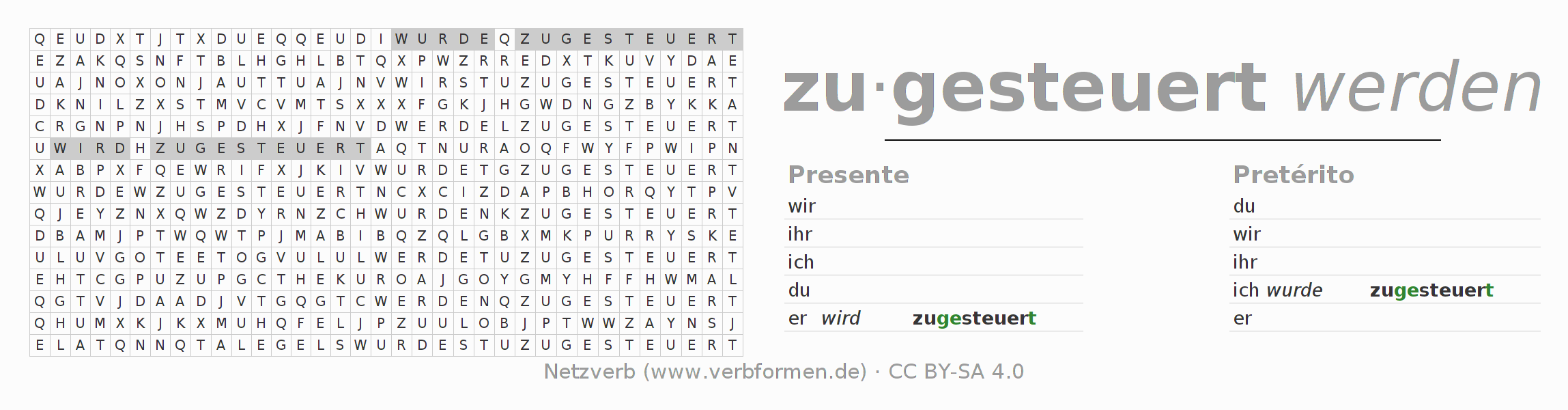 Con el juego de palabras cruzadas (Wortsuchrätsel o Suchsel) puedes aprender las conjugaciones alemanas. Tienes que armar cada una de las formas verbales para después encontrarlas dentro de una sopa de letras. También puedes proceder de forma contraria. Una vez que encuentras un verbo conjugado, tienes que descubrir a qué forma verbal pertenece. Para descargar e imprimir, puedes acceder por aquí a una versión en PDF-Versión o también como imagen. También hay muchas otras hojas de ejercicios para los verbos zusteuern. Todo el material de estudio es Open Educational Resources (OER), es decir, libre de licencias CC BY-SA 4.0 y puede ser descargado y utilizado de forma gratuita. En este link en la sección de ayuda encuentras más información Poner en práctica las sopas de letras en el aula y el autoaprendizaje..