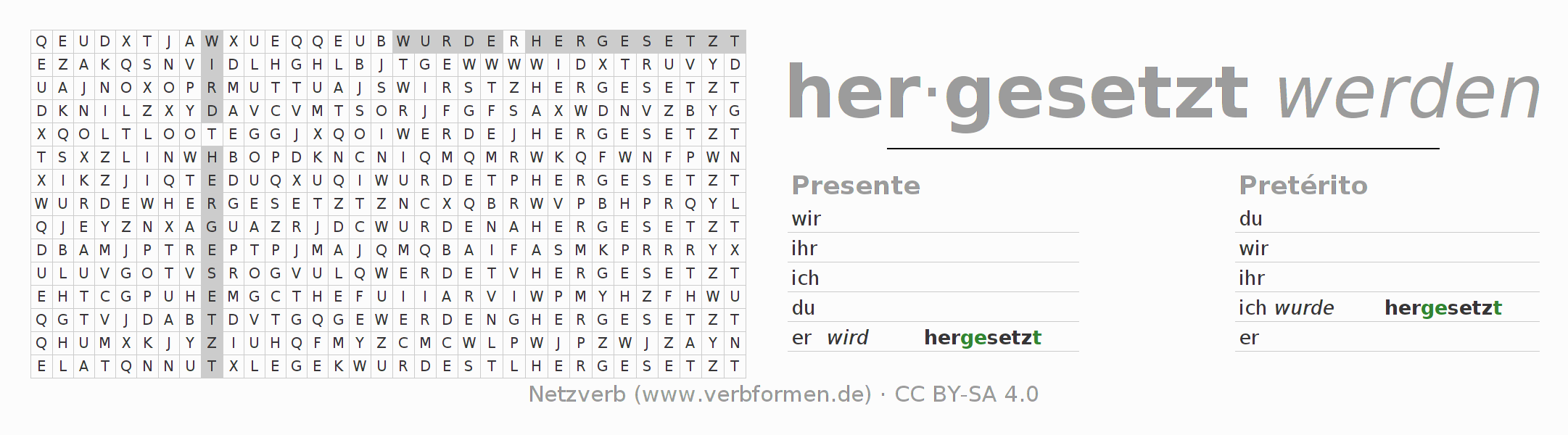 Con el juego de palabras cruzadas (Wortsuchrätsel o Suchsel) puedes aprender las conjugaciones alemanas. Tienes que armar cada una de las formas verbales para después encontrarlas dentro de una sopa de letras. También puedes proceder de forma contraria. Una vez que encuentras un verbo conjugado, tienes que descubrir a qué forma verbal pertenece. Para descargar e imprimir, puedes acceder por aquí a una versión en PDF-Versión o también como imagen. También hay muchas otras hojas de ejercicios para los verbos hersetzen. Todo el material de estudio es Open Educational Resources (OER), es decir, libre de licencias CC BY-SA 4.0 y puede ser descargado y utilizado de forma gratuita. En este link en la sección de ayuda encuentras más información Poner en práctica las sopas de letras en el aula y el autoaprendizaje..