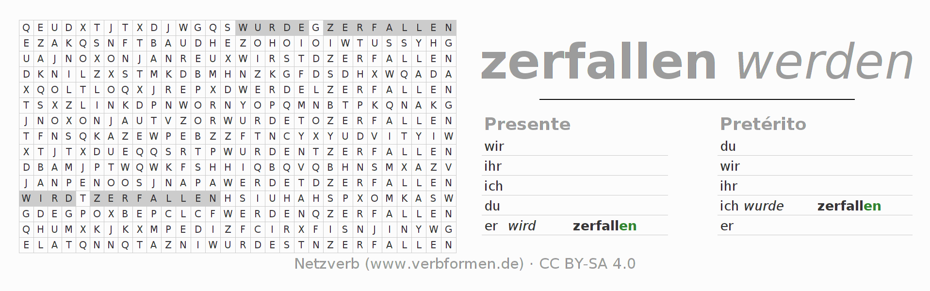 Juego de palabras cruzadas para conjugar el verbo alemán zerfallen.