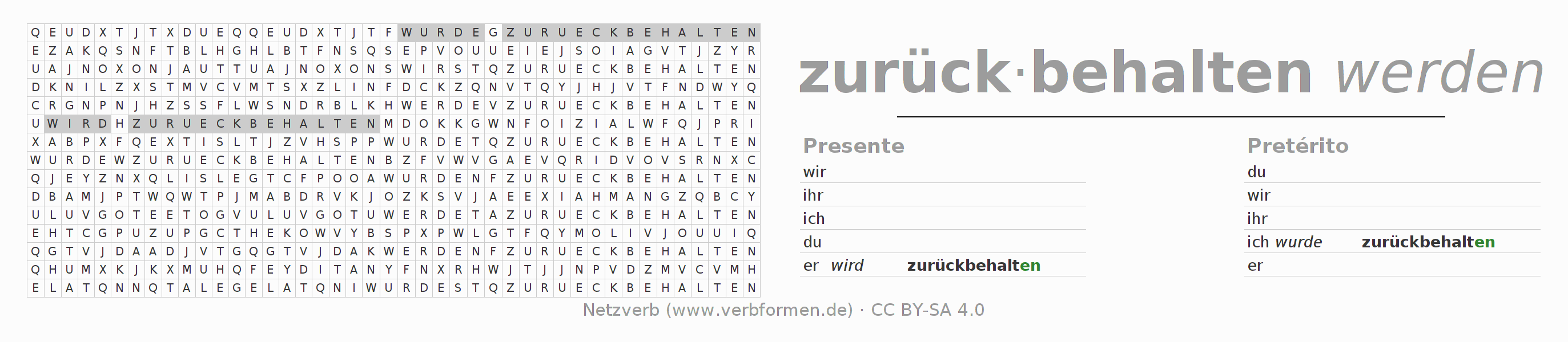 Guía: forma las construcciones correctas para el verbo zurückbehalten y encuéntralas en el acertijo. O también encuentra la conjugación de zurückbehalten en la sopa de letras y ordénala en la construcción verbal correcta. Las diéresis y el ß aparecen escritos como: ss (ß), oe (ö), ae (ä) y ue (ü).La solución se encuentra al final de la página.