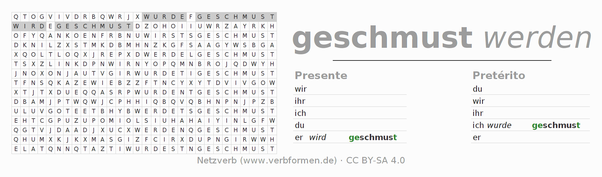 Con el juego de palabras cruzadas (Wortsuchrätsel o Suchsel) puedes aprender las conjugaciones alemanas. Tienes que armar cada una de las formas verbales para después encontrarlas dentro de una sopa de letras. También puedes proceder de forma contraria. Una vez que encuentras un verbo conjugado, tienes que descubrir a qué forma verbal pertenece. Para descargar e imprimir, puedes acceder por aquí a una versión en PDF-Versión o también como imagen. También hay muchas otras hojas de ejercicios para los verbos schmusen. Todo el material de estudio es Open Educational Resources (OER), es decir, libre de licencias CC BY-SA 4.0 y puede ser descargado y utilizado de forma gratuita. En este link en la sección de ayuda encuentras más información Poner en práctica las sopas de letras en el aula y el autoaprendizaje..