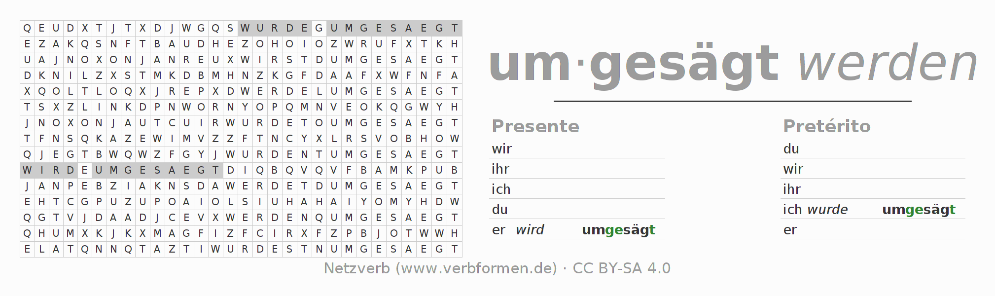 Guía: forma las construcciones correctas para el verbo umsägen y encuéntralas en el acertijo. O también encuentra la conjugación de umsägen en la sopa de letras y ordénala en la construcción verbal correcta. Las diéresis y el ß aparecen escritos como: ss (ß), oe (ö), ae (ä) y ue (ü).La solución se encuentra al final de la página.