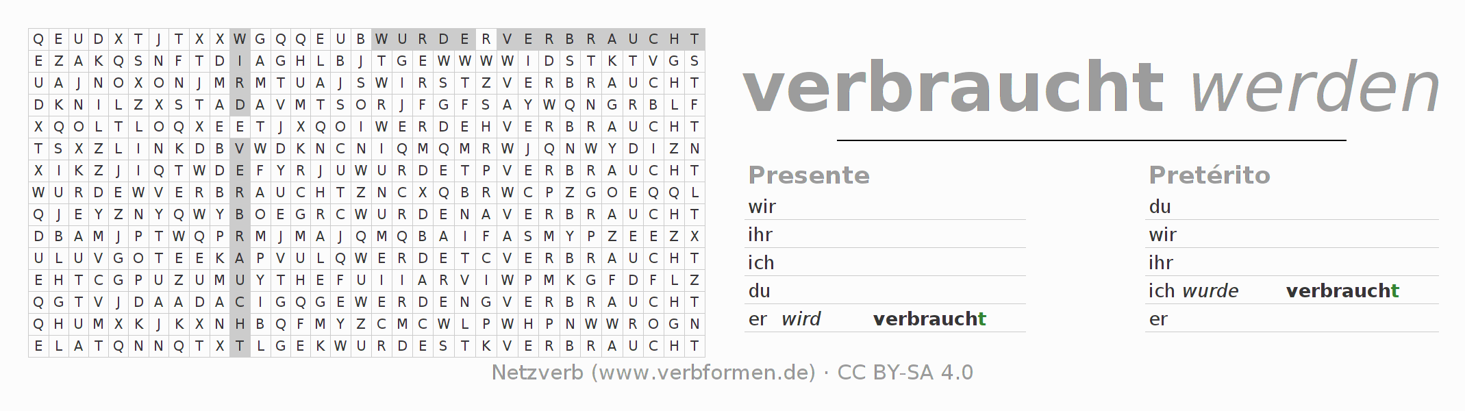 Con el juego de palabras cruzadas (Wortsuchrätsel o Suchsel) puedes aprender las conjugaciones alemanas. Tienes que armar cada una de las formas verbales para después encontrarlas dentro de una sopa de letras. También puedes proceder de forma contraria. Una vez que encuentras un verbo conjugado, tienes que descubrir a qué forma verbal pertenece. Para descargar e imprimir, puedes acceder por aquí a una versión en PDF-Versión o también como imagen. También hay muchas otras hojas de ejercicios para los verbos verbrauchen. Todo el material de estudio es Open Educational Resources (OER), es decir, libre de licencias CC BY-SA 4.0 y puede ser descargado y utilizado de forma gratuita. En este link en la sección de ayuda encuentras más información Poner en práctica las sopas de letras en el aula y el autoaprendizaje..