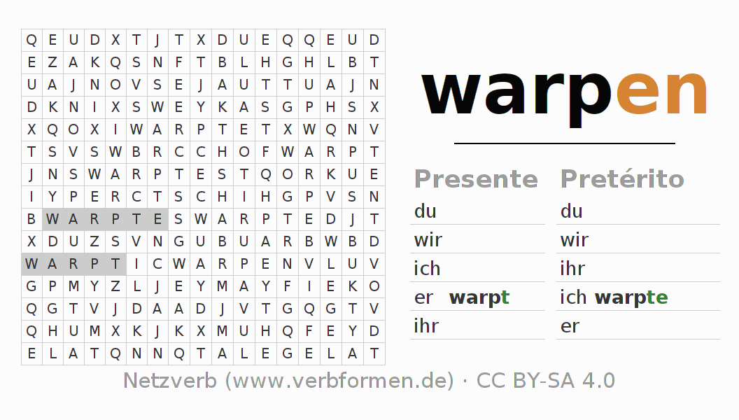 Guía: forma las construcciones correctas para el verbo warpen y encuéntralas en el acertijo. O también encuentra la conjugación de warpen en la sopa de letras y ordénala en la construcción verbal correcta. Las diéresis y el ß aparecen escritos como: ss (ß), oe (ö), ae (ä) y ue (ü).La solución se encuentra al final de la página.