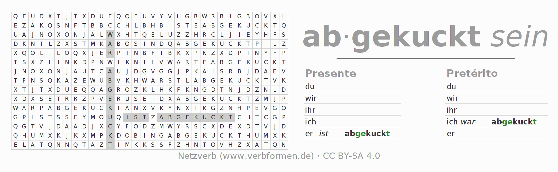 Con el juego de palabras cruzadas (Wortsuchrätsel o Suchsel) puedes aprender las conjugaciones alemanas. Tienes que armar cada una de las formas verbales para después encontrarlas dentro de una sopa de letras. También puedes proceder de forma contraria. Una vez que encuentras un verbo conjugado, tienes que descubrir a qué forma verbal pertenece. Para descargar e imprimir, puedes acceder por aquí a una versión en PDF-Versión o también como imagen. También hay muchas otras hojas de ejercicios para los verbos abkucken. Todo el material de estudio es Open Educational Resources (OER), es decir, libre de licencias CC BY-SA 4.0 y puede ser descargado y utilizado de forma gratuita. En este link en la sección de ayuda encuentras más información Poner en práctica las sopas de letras en el aula y el autoaprendizaje..