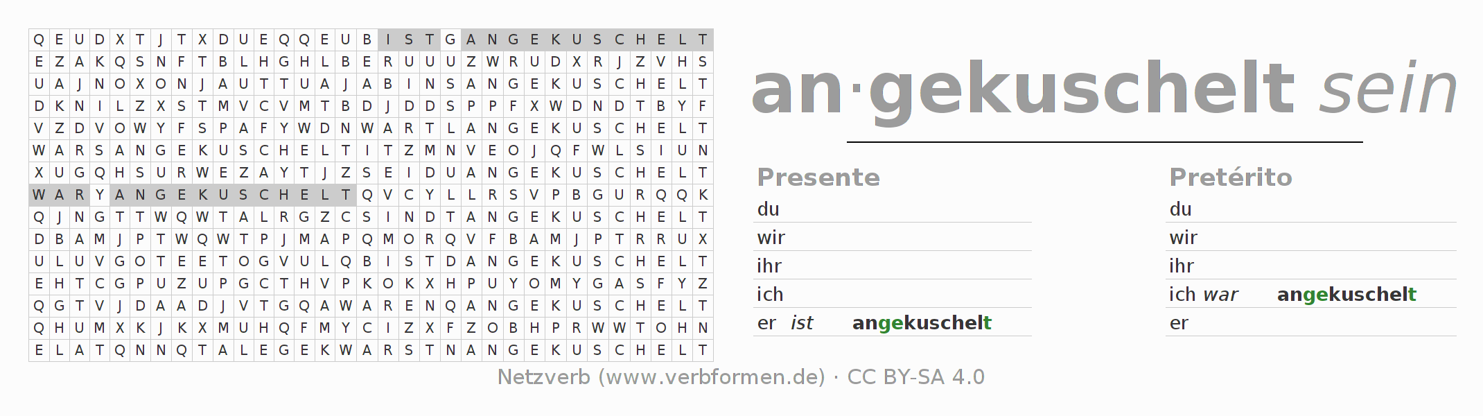 Guía: forma las construcciones correctas para el verbo ankuscheln y encuéntralas en el acertijo. O también encuentra la conjugación de ankuscheln en la sopa de letras y ordénala en la construcción verbal correcta. Las diéresis y el ß aparecen escritos como: ss (ß), oe (ö), ae (ä) y ue (ü).La solución se encuentra al final de la página.
