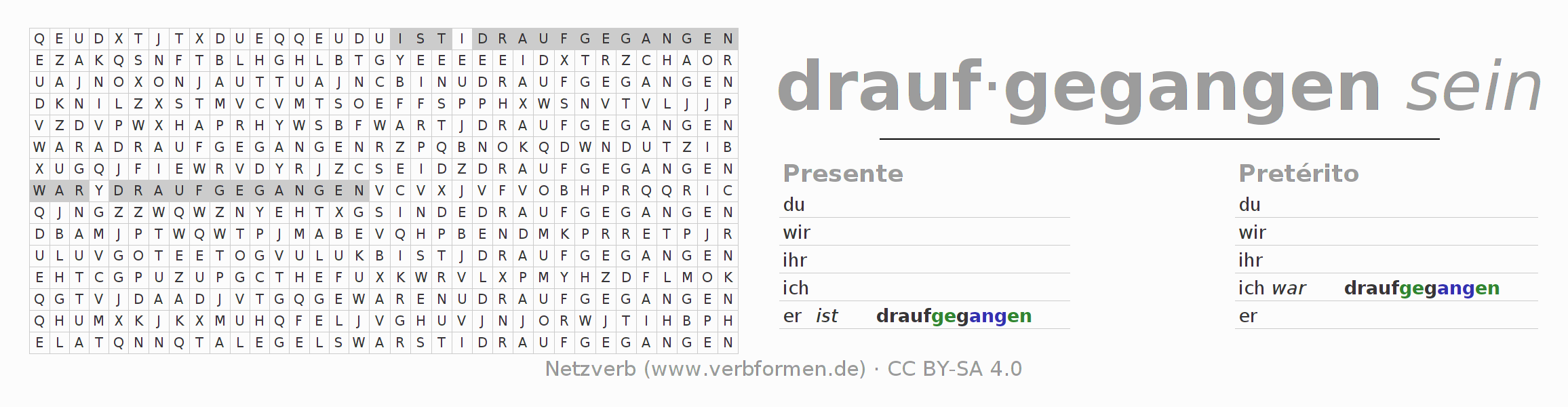Guía: forma las construcciones correctas para el verbo draufgehen y encuéntralas en el acertijo. O también encuentra la conjugación de draufgehen en la sopa de letras y ordénala en la construcción verbal correcta. Las diéresis y el ß aparecen escritos como: ss (ß), oe (ö), ae (ä) y ue (ü).La solución se encuentra al final de la página.