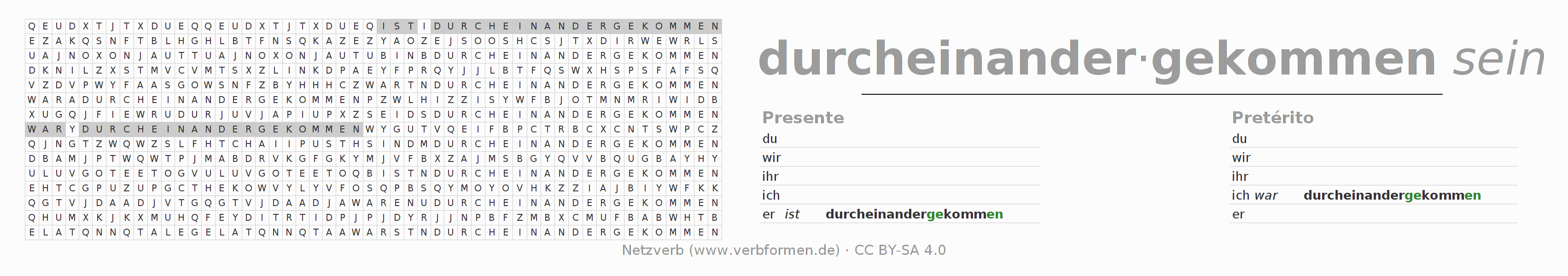 Guía: forma las construcciones correctas para el verbo durcheinanderkommen y encuéntralas en el acertijo. O también encuentra la conjugación de durcheinanderkommen en la sopa de letras y ordénala en la construcción verbal correcta. Las diéresis y el ß aparecen escritos como: ss (ß), oe (ö), ae (ä) y ue (ü).La solución se encuentra al final de la página.