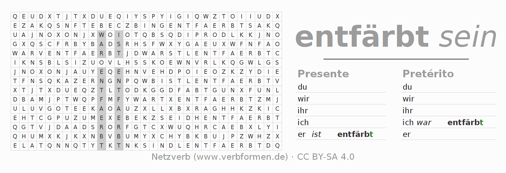 Guía: forma las construcciones correctas para el verbo entfärben y encuéntralas en el acertijo. O también encuentra la conjugación de entfärben en la sopa de letras y ordénala en la construcción verbal correcta. Las diéresis y el ß aparecen escritos como: ss (ß), oe (ö), ae (ä) y ue (ü).La solución se encuentra al final de la página.