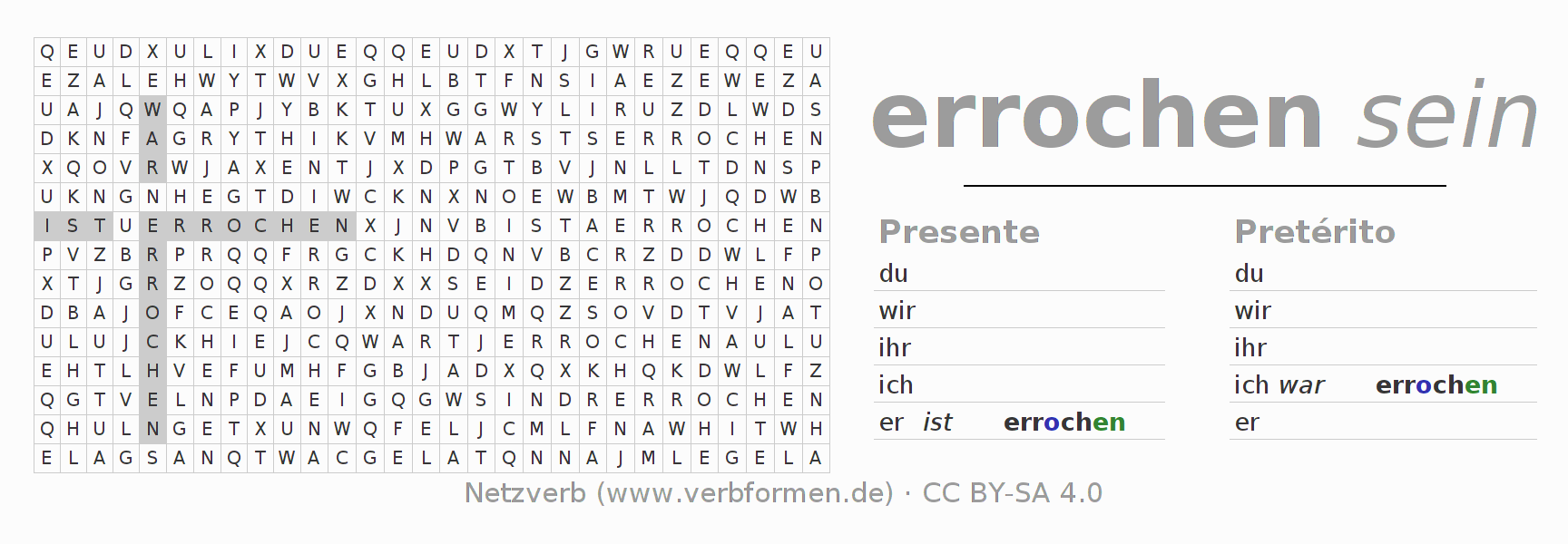 Con el juego de palabras cruzadas (Wortsuchrätsel o Suchsel) puedes aprender las conjugaciones alemanas. Tienes que armar cada una de las formas verbales para después encontrarlas dentro de una sopa de letras. También puedes proceder de forma contraria. Una vez que encuentras un verbo conjugado, tienes que descubrir a qué forma verbal pertenece. Para descargar e imprimir, puedes acceder por aquí a una versión en PDF-Versión o también como imagen. También hay muchas otras hojas de ejercicios para los verbos erriechen. Todo el material de estudio es Open Educational Resources (OER), es decir, libre de licencias CC BY-SA 4.0 y puede ser descargado y utilizado de forma gratuita. En este link en la sección de ayuda encuentras más información Poner en práctica las sopas de letras en el aula y el autoaprendizaje..
