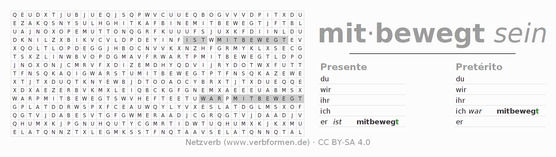 Guía: forma las construcciones correctas para el verbo mitbewegen y encuéntralas en el acertijo. O también encuentra la conjugación de mitbewegen en la sopa de letras y ordénala en la construcción verbal correcta. Las diéresis y el ß aparecen escritos como: ss (ß), oe (ö), ae (ä) y ue (ü).La solución se encuentra al final de la página.