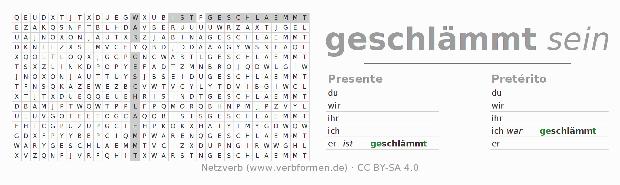 Con el juego de palabras cruzadas (Wortsuchrätsel o Suchsel) puedes aprender las conjugaciones alemanas. Tienes que armar cada una de las formas verbales para después encontrarlas dentro de una sopa de letras. También puedes proceder de forma contraria. Una vez que encuentras un verbo conjugado, tienes que descubrir a qué forma verbal pertenece. Para descargar e imprimir, puedes acceder por aquí a una versión en PDF-Versión o también como imagen. También hay muchas otras hojas de ejercicios para los verbos schlämmen. Todo el material de estudio es Open Educational Resources (OER), es decir, libre de licencias CC BY-SA 4.0 y puede ser descargado y utilizado de forma gratuita. En este link en la sección de ayuda encuentras más información Poner en práctica las sopas de letras en el aula y el autoaprendizaje..