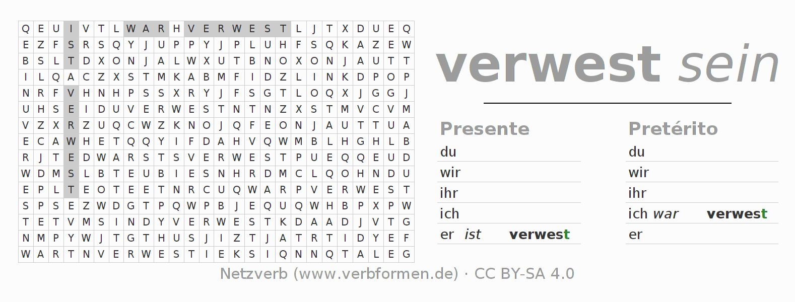 Guía: forma las construcciones correctas para el verbo verwesen y encuéntralas en el acertijo. O también encuentra la conjugación de verwesen en la sopa de letras y ordénala en la construcción verbal correcta. Las diéresis y el ß aparecen escritos como: ss (ß), oe (ö), ae (ä) y ue (ü).La solución se encuentra al final de la página.