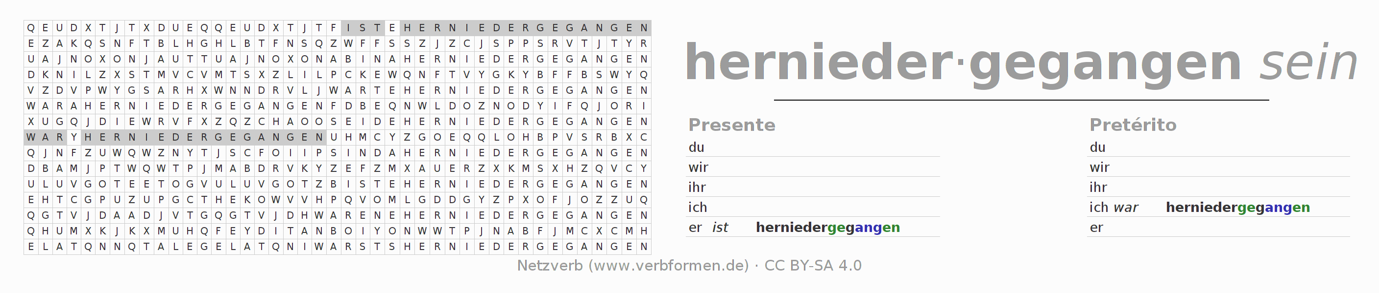 Guía: forma las construcciones correctas para el verbo herniedergehen y encuéntralas en el acertijo. O también encuentra la conjugación de herniedergehen en la sopa de letras y ordénala en la construcción verbal correcta. Las diéresis y el ß aparecen escritos como: ss (ß), oe (ö), ae (ä) y ue (ü).La solución se encuentra al final de la página.