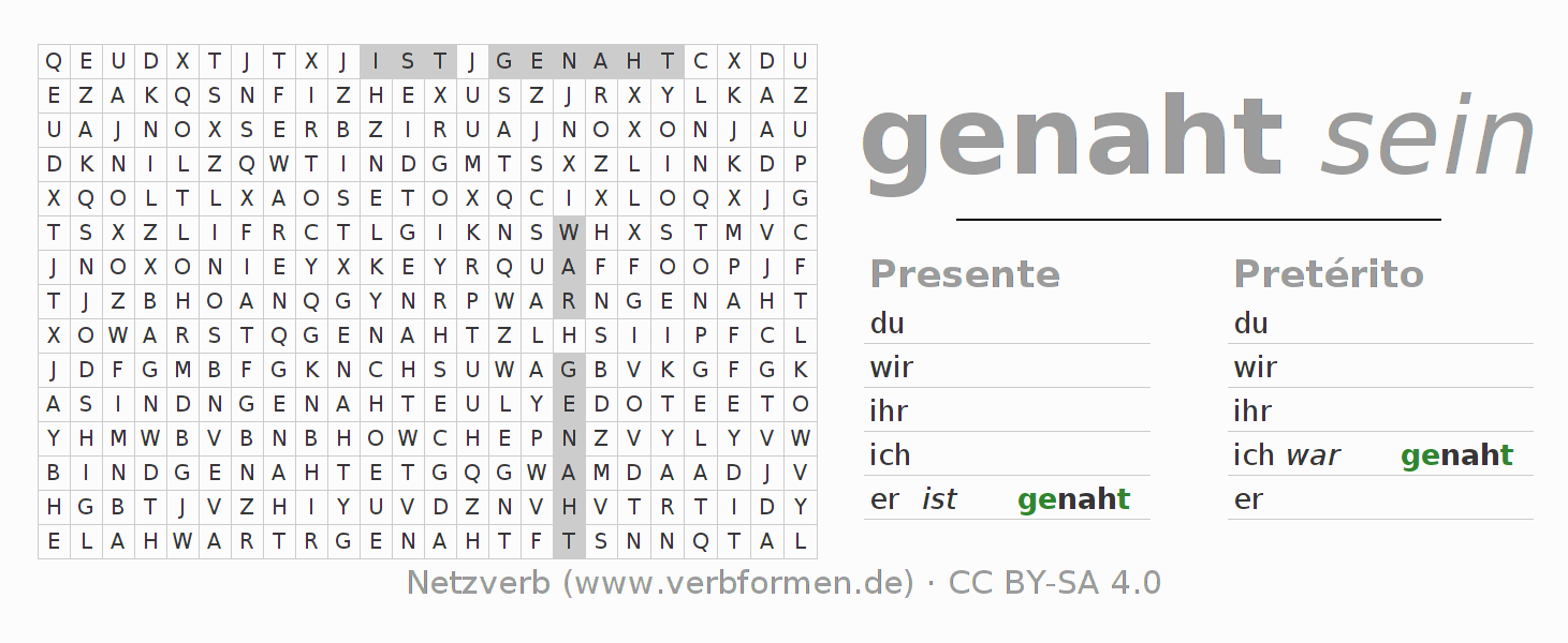 Guía: forma las construcciones correctas para el verbo nahen y encuéntralas en el acertijo. O también encuentra la conjugación de nahen en la sopa de letras y ordénala en la construcción verbal correcta. Las diéresis y el ß aparecen escritos como: ss (ß), oe (ö), ae (ä) y ue (ü).La solución se encuentra al final de la página.
