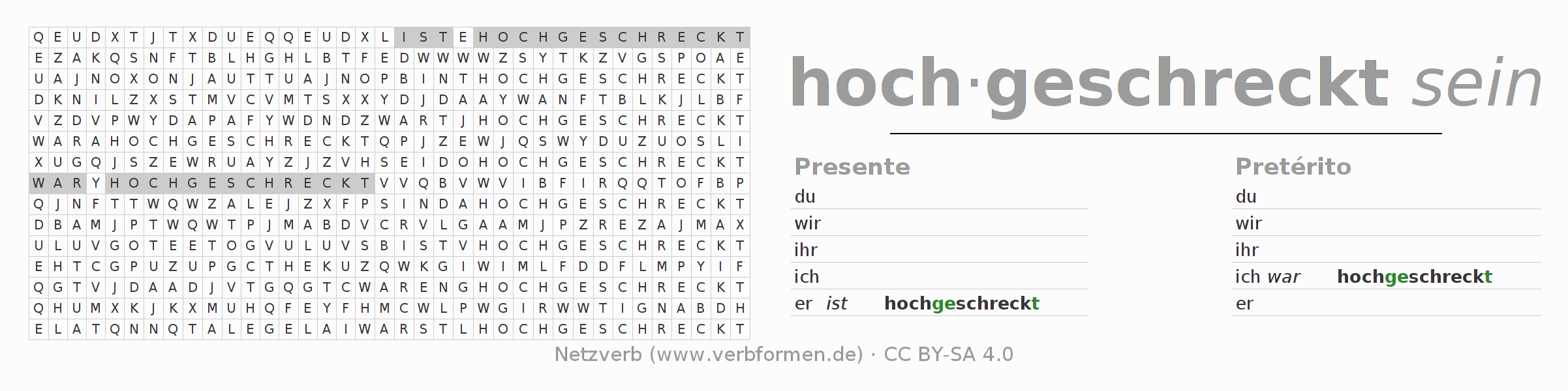 Con el juego de palabras cruzadas (Wortsuchrätsel o Suchsel) puedes aprender las conjugaciones alemanas. Tienes que armar cada una de las formas verbales para después encontrarlas dentro de una sopa de letras. También puedes proceder de forma contraria. Una vez que encuentras un verbo conjugado, tienes que descubrir a qué forma verbal pertenece. Para descargar e imprimir, puedes acceder por aquí a una versión en PDF-Versión o también como imagen. También hay muchas otras hojas de ejercicios para los verbos hochschrecken. Todo el material de estudio es Open Educational Resources (OER), es decir, libre de licencias CC BY-SA 4.0 y puede ser descargado y utilizado de forma gratuita. En este link en la sección de ayuda encuentras más información Poner en práctica las sopas de letras en el aula y el autoaprendizaje..
