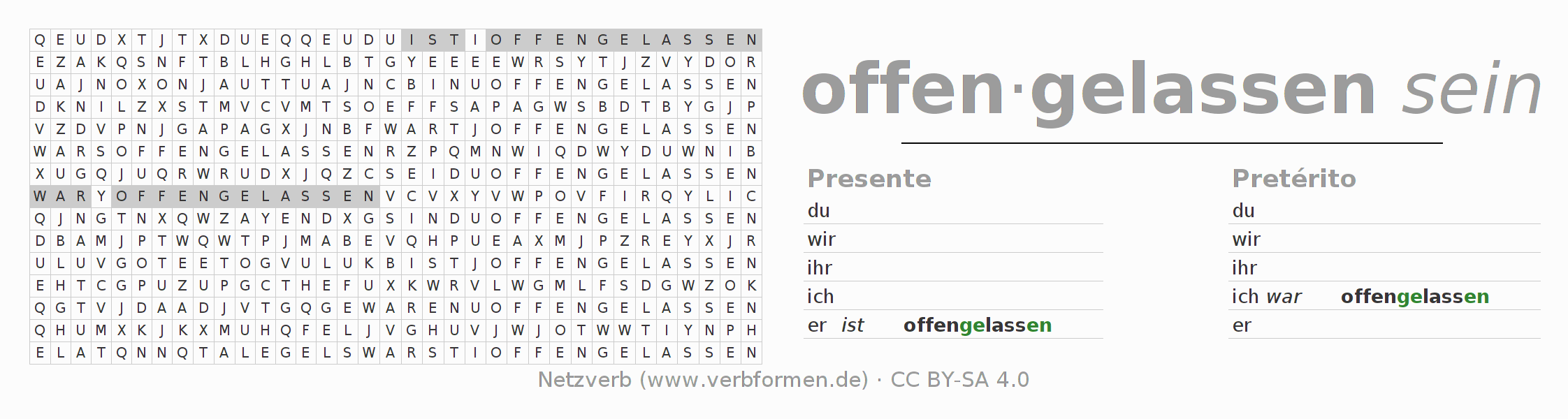 Con el juego de palabras cruzadas (Wortsuchrätsel o Suchsel) puedes aprender las conjugaciones alemanas. Tienes que armar cada una de las formas verbales para después encontrarlas dentro de una sopa de letras. También puedes proceder de forma contraria. Una vez que encuentras un verbo conjugado, tienes que descubrir a qué forma verbal pertenece. Para descargar e imprimir, puedes acceder por aquí a una versión en PDF-Versión o también como imagen. También hay muchas otras hojas de ejercicios para los verbos offenlassen. Todo el material de estudio es Open Educational Resources (OER), es decir, libre de licencias CC BY-SA 4.0 y puede ser descargado y utilizado de forma gratuita. En este link en la sección de ayuda encuentras más información Poner en práctica las sopas de letras en el aula y el autoaprendizaje..