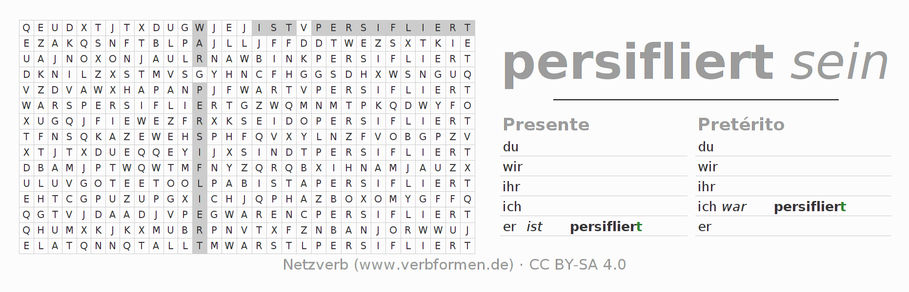 Guía: forma las construcciones correctas para el verbo persiflieren y encuéntralas en el acertijo. O también encuentra la conjugación de persiflieren en la sopa de letras y ordénala en la construcción verbal correcta. Las diéresis y el ß aparecen escritos como: ss (ß), oe (ö), ae (ä) y ue (ü).La solución se encuentra al final de la página.