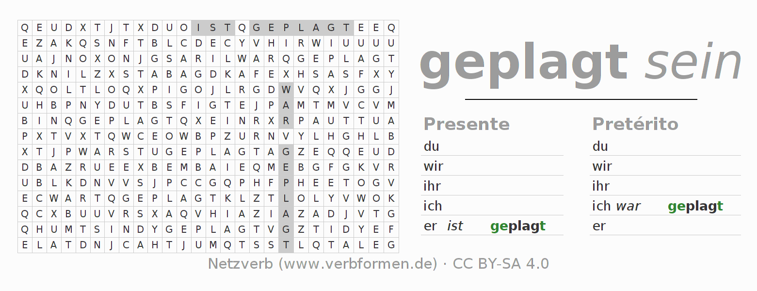 Guía: forma las construcciones correctas para el verbo plagen y encuéntralas en el acertijo. O también encuentra la conjugación de plagen en la sopa de letras y ordénala en la construcción verbal correcta. Las diéresis y el ß aparecen escritos como: ss (ß), oe (ö), ae (ä) y ue (ü).La solución se encuentra al final de la página.