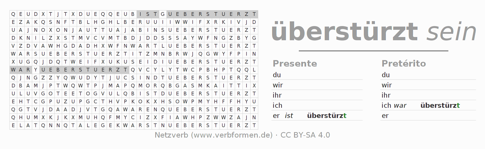 Guía: forma las construcciones correctas para el verbo sich überstürzen y encuéntralas en el acertijo. O también encuentra la conjugación de sich überstürzen en la sopa de letras y ordénala en la construcción verbal correcta. Las diéresis y el ß aparecen escritos como: ss (ß), oe (ö), ae (ä) y ue (ü).La solución se encuentra al final de la página.