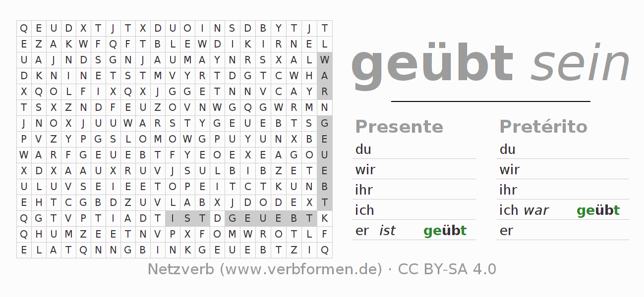 Guía: forma las construcciones correctas para el verbo üben y encuéntralas en el acertijo. O también encuentra la conjugación de üben en la sopa de letras y ordénala en la construcción verbal correcta. Las diéresis y el ß aparecen escritos como: ss (ß), oe (ö), ae (ä) y ue (ü).La solución se encuentra al final de la página.