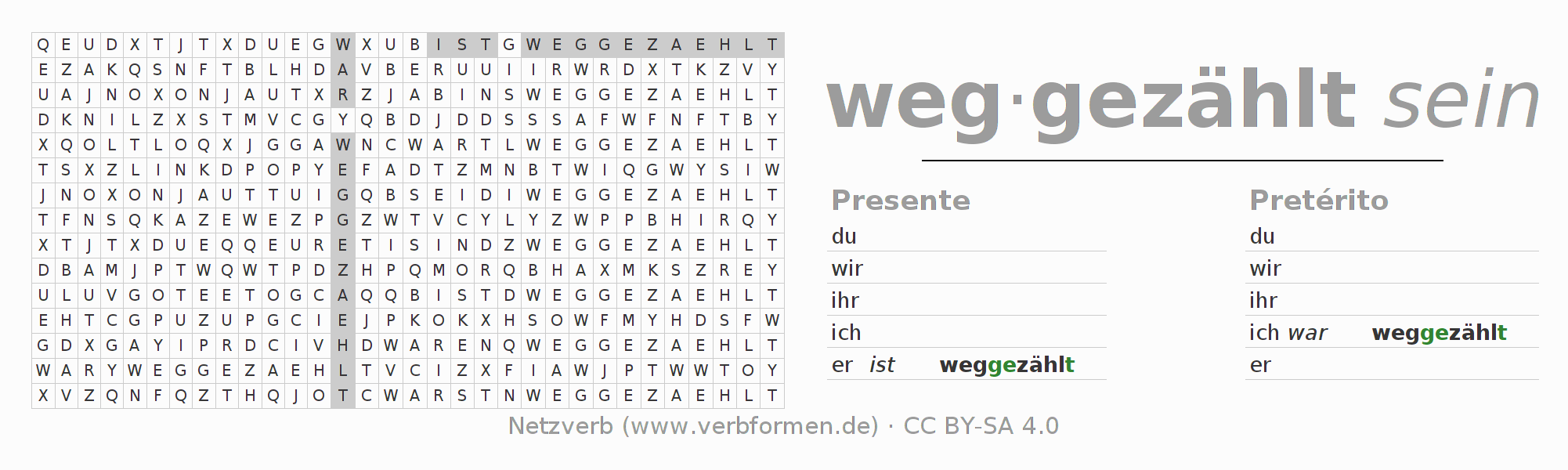 Guía: forma las construcciones correctas para el verbo wegzählen y encuéntralas en el acertijo. O también encuentra la conjugación de wegzählen en la sopa de letras y ordénala en la construcción verbal correcta. Las diéresis y el ß aparecen escritos como: ss (ß), oe (ö), ae (ä) y ue (ü).La solución se encuentra al final de la página.