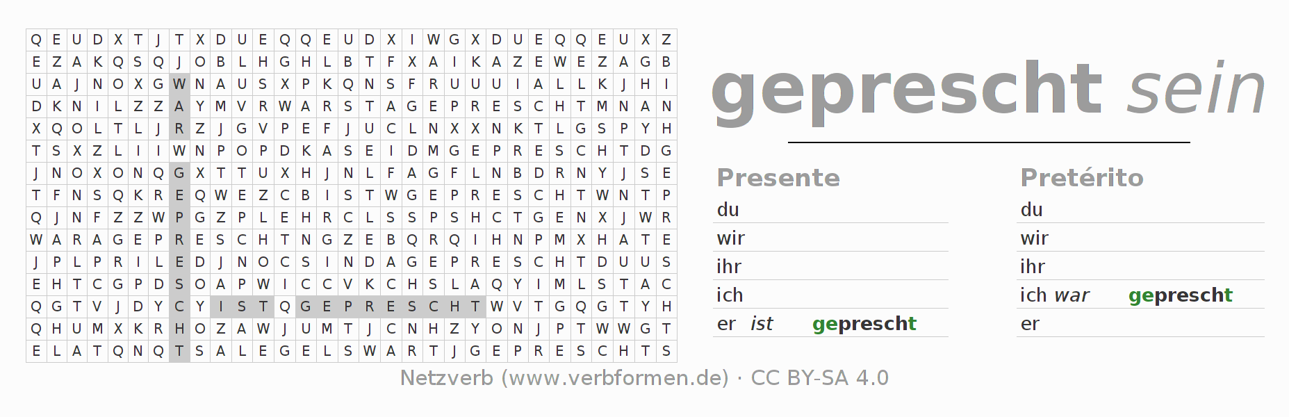 Guía: forma las construcciones correctas para el verbo preschen y encuéntralas en el acertijo. O también encuentra la conjugación de preschen en la sopa de letras y ordénala en la construcción verbal correcta. Las diéresis y el ß aparecen escritos como: ss (ß), oe (ö), ae (ä) y ue (ü).La solución se encuentra al final de la página.