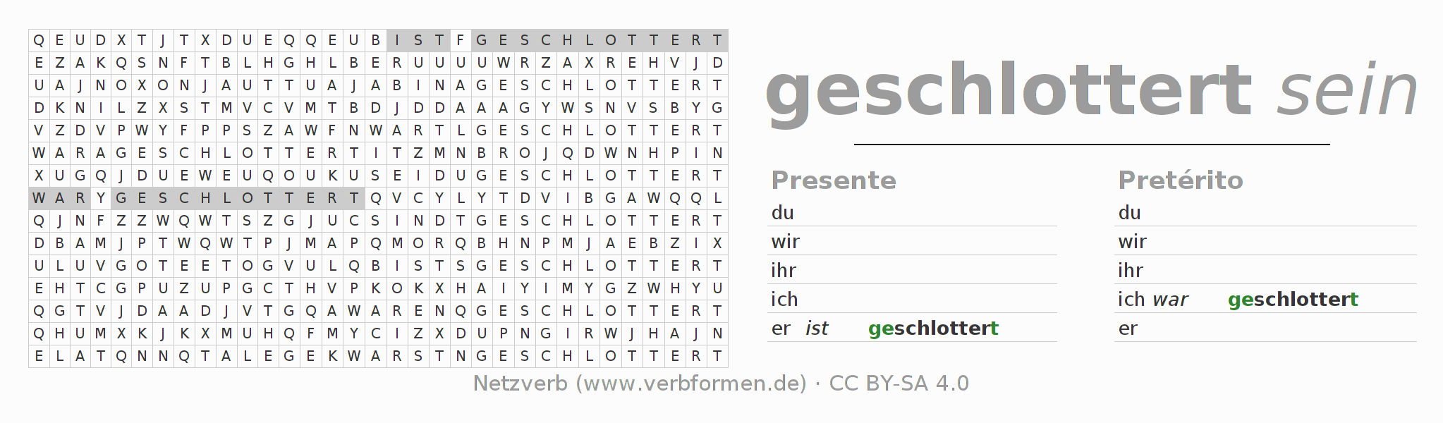 Con el juego de palabras cruzadas (Wortsuchrätsel o Suchsel) puedes aprender las conjugaciones alemanas. Tienes que armar cada una de las formas verbales para después encontrarlas dentro de una sopa de letras. También puedes proceder de forma contraria. Una vez que encuentras un verbo conjugado, tienes que descubrir a qué forma verbal pertenece. Para descargar e imprimir, puedes acceder por aquí a una versión en PDF-Versión o también como imagen. También hay muchas otras hojas de ejercicios para los verbos schlottern. Todo el material de estudio es Open Educational Resources (OER), es decir, libre de licencias CC BY-SA 4.0 y puede ser descargado y utilizado de forma gratuita. En este link en la sección de ayuda encuentras más información Poner en práctica las sopas de letras en el aula y el autoaprendizaje..