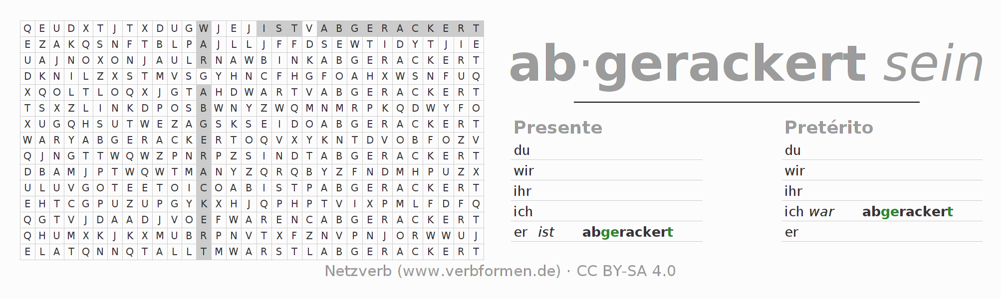 Guía: forma las construcciones correctas para el verbo sich abrackern y encuéntralas en el acertijo. O también encuentra la conjugación de sich abrackern en la sopa de letras y ordénala en la construcción verbal correcta. Las diéresis y el ß aparecen escritos como: ss (ß), oe (ö), ae (ä) y ue (ü).La solución se encuentra al final de la página.