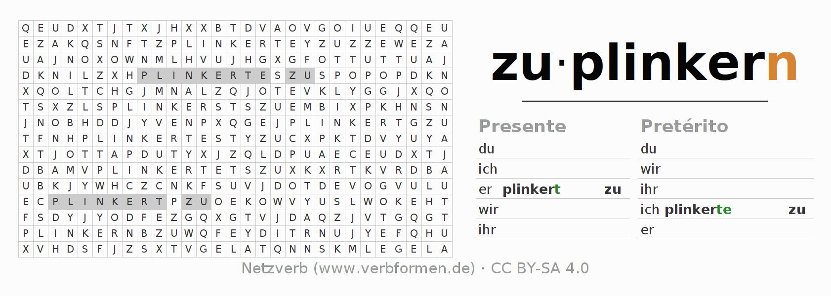 Guía: forma las construcciones correctas para el verbo zuplinkern y encuéntralas en el acertijo. O también encuentra la conjugación de zuplinkern en la sopa de letras y ordénala en la construcción verbal correcta. Las diéresis y el ß aparecen escritos como: ss (ß), oe (ö), ae (ä) y ue (ü).La solución se encuentra al final de la página.