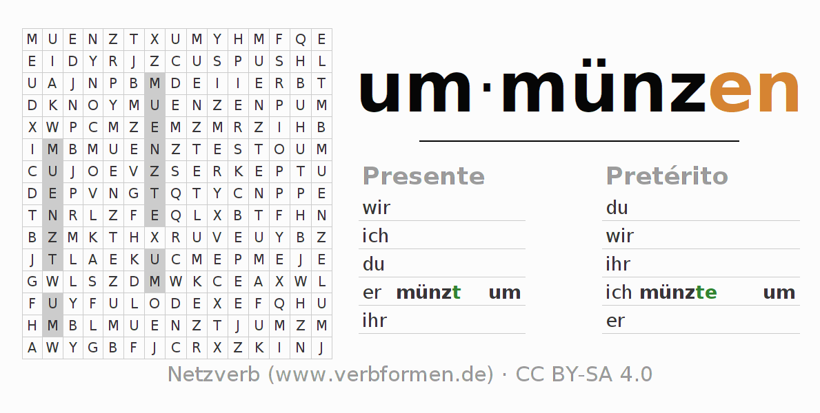 Las hojas de trabajo te ayudan para practicar con la conjugación de los verbos ummünzen en la escuela o de forma autodidacta. El material de estudio es Open Educational Resources (OER), es decir, libre de licencias CC BY-SA 4.0 y pude ser descargado y utilizado de forma gratuita, por ejemplo para la escuela. Con este fin tenemos para ti varios tipos de hojas de trabajo para los verbos ummünzen en forma de tablas de conjugación, acertijos y juegos. Todo el material esta disponible de forma gratuita para descargas PDF, imágenes y paginas web interactivas. Junto con los ejercicios hay innumerables ejemplos ummünzen que te ayudan en el uso de los verbos.