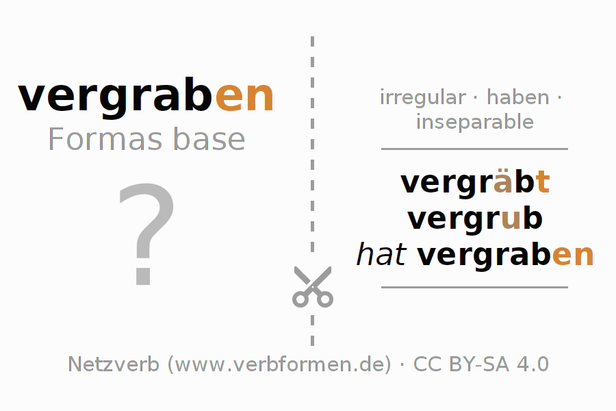 Las hojas de trabajo te ayudan para practicar con la conjugación de los verbos vergraben en la escuela o de forma autodidacta. El material de estudio es Open Educational Resources (OER), es decir, libre de licencias CC BY-SA 4.0 y pude ser descargado y utilizado de forma gratuita, por ejemplo para la escuela. Con este fin tenemos para ti varios tipos de hojas de trabajo para los verbos vergraben en forma de tablas de conjugación, acertijos y juegos. Todo el material esta disponible de forma gratuita para descargas PDF, imágenes y paginas web interactivas. Junto con los ejercicios hay innumerables ejemplos vergraben que te ayudan en el uso de los verbos.