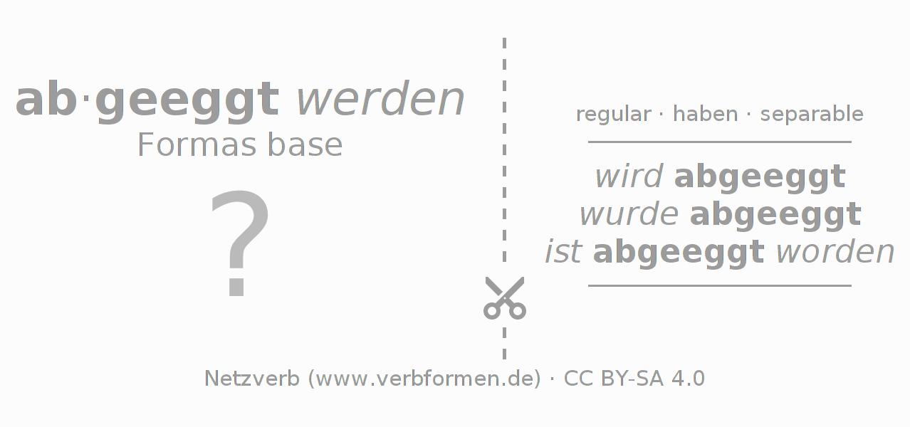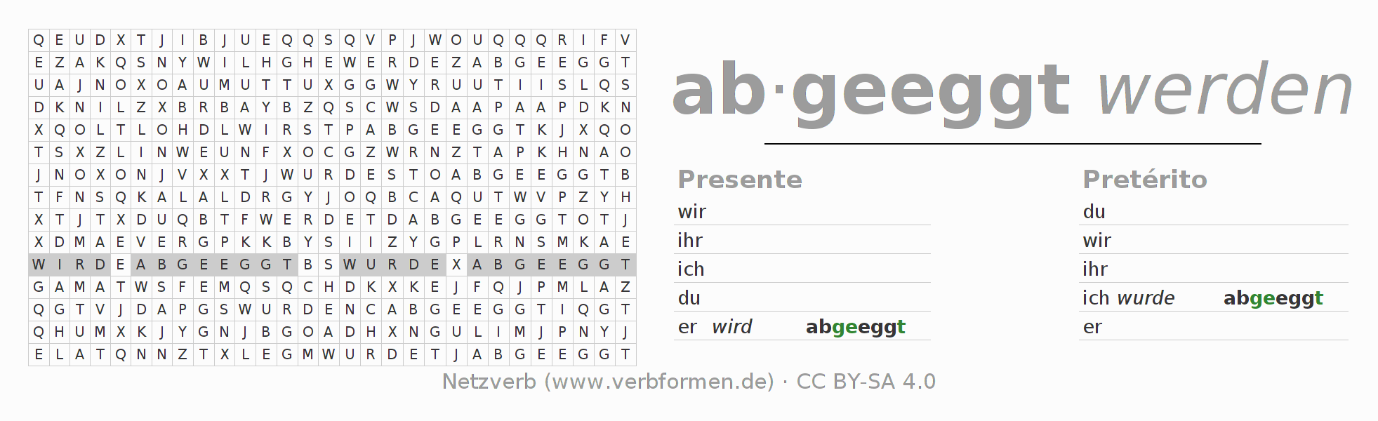 Las hojas de trabajo te ayudan para practicar con la conjugación de los verbos abeggen en la escuela o de forma autodidacta. El material de estudio es Open Educational Resources (OER), es decir, libre de licencias CC BY-SA 4.0 y pude ser descargado y utilizado de forma gratuita, por ejemplo para la escuela. Con este fin tenemos para ti varios tipos de hojas de trabajo para los verbos abeggen en forma de tablas de conjugación, acertijos y juegos. Todo el material esta disponible de forma gratuita para descargas PDF, imágenes y paginas web interactivas. Junto con los ejercicios hay innumerables ejemplos abeggen que te ayudan en el uso de los verbos.