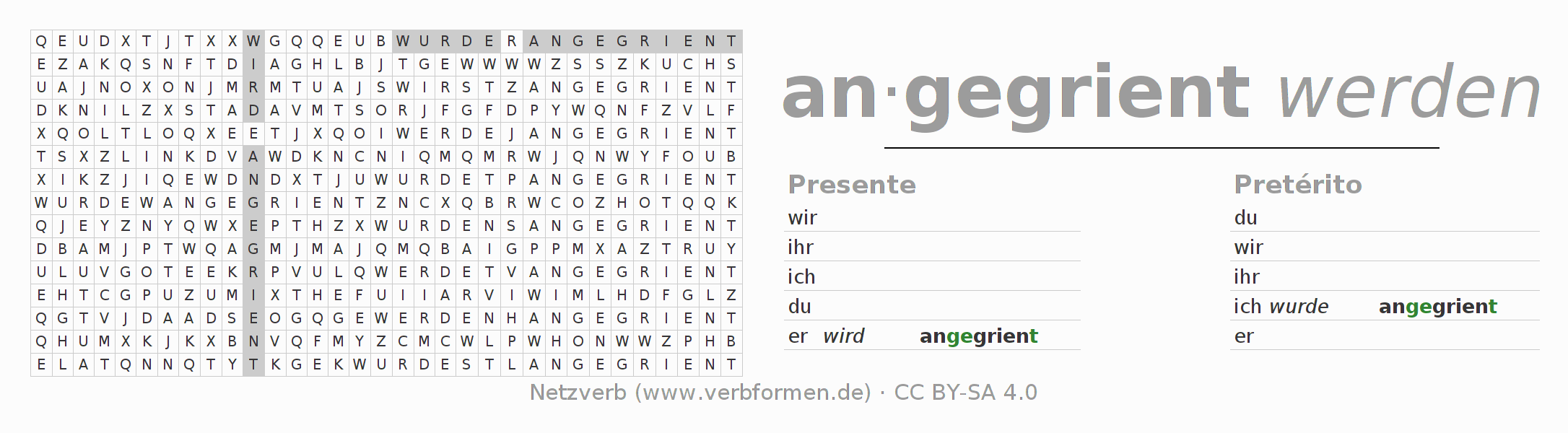 Las hojas de trabajo te ayudan para practicar con la conjugación de los verbos angrienen en la escuela o de forma autodidacta. El material de estudio es Open Educational Resources (OER), es decir, libre de licencias CC BY-SA 4.0 y pude ser descargado y utilizado de forma gratuita, por ejemplo para la escuela. Con este fin tenemos para ti varios tipos de hojas de trabajo para los verbos angrienen en forma de tablas de conjugación, acertijos y juegos. Todo el material esta disponible de forma gratuita para descargas PDF, imágenes y paginas web interactivas. Junto con los ejercicios hay innumerables ejemplos angrienen que te ayudan en el uso de los verbos.