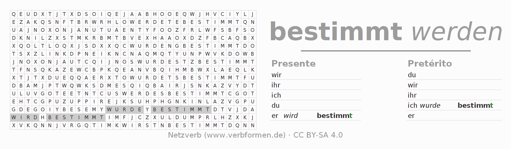 Las hojas de trabajo te ayudan para practicar con la conjugación de los verbos bestimmen en la escuela o de forma autodidacta. El material de estudio es Open Educational Resources (OER), es decir, libre de licencias CC BY-SA 4.0 y pude ser descargado y utilizado de forma gratuita, por ejemplo para la escuela. Con este fin tenemos para ti varios tipos de hojas de trabajo para los verbos bestimmen en forma de tablas de conjugación, acertijos y juegos. Todo el material esta disponible de forma gratuita para descargas PDF, imágenes y paginas web interactivas. Junto con los ejercicios hay innumerables ejemplos bestimmen que te ayudan en el uso de los verbos.