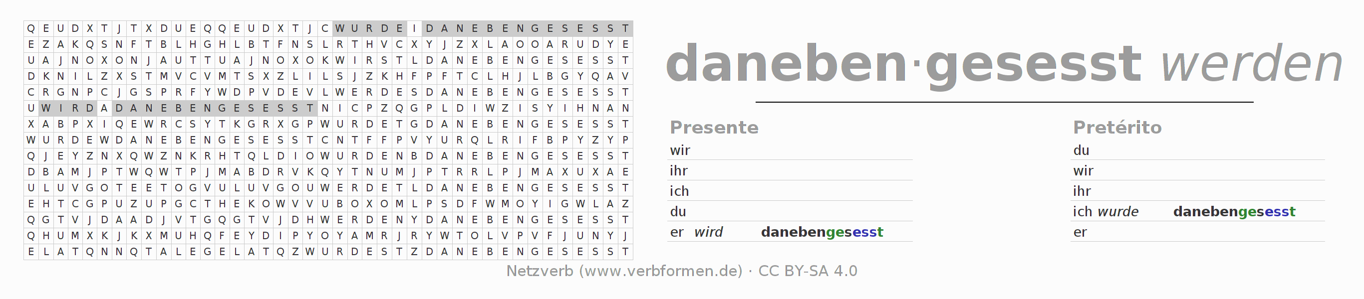 Las hojas de trabajo te ayudan para practicar con la conjugación de los verbos danebensitzen en la escuela o de forma autodidacta. El material de estudio es Open Educational Resources (OER), es decir, libre de licencias CC BY-SA 4.0 y pude ser descargado y utilizado de forma gratuita, por ejemplo para la escuela. Con este fin tenemos para ti varios tipos de hojas de trabajo para los verbos danebensitzen en forma de tablas de conjugación, acertijos y juegos. Todo el material esta disponible de forma gratuita para descargas PDF, imágenes y paginas web interactivas. Junto con los ejercicios hay innumerables ejemplos danebensitzen que te ayudan en el uso de los verbos.