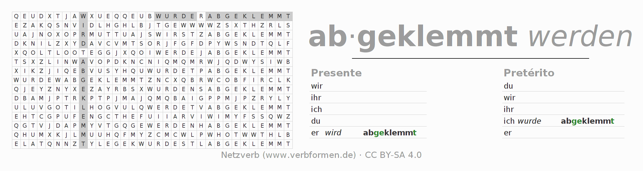 Con este juego de palabras cruzadas puedes aprender de manera desafiante la conjugación del verbo alemán abklemmen.