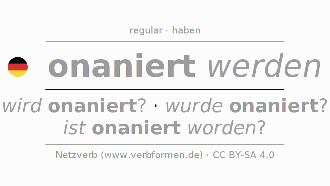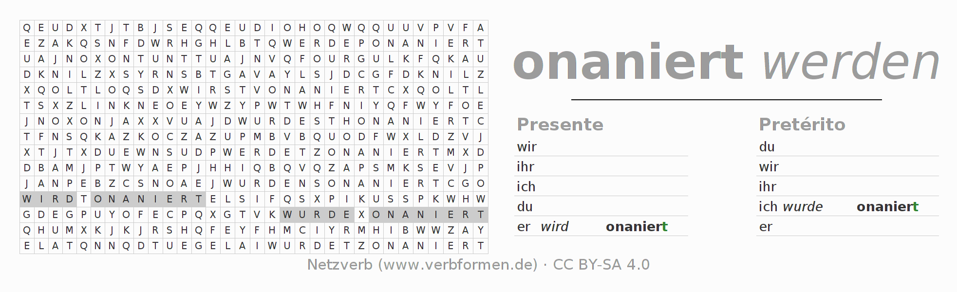 Las hojas de trabajo te ayudan para practicar con la conjugación de los verbos onanieren en la escuela o de forma autodidacta. El material de estudio es Open Educational Resources (OER), es decir, libre de licencias CC BY-SA 4.0 y pude ser descargado y utilizado de forma gratuita, por ejemplo para la escuela. Con este fin tenemos para ti varios tipos de hojas de trabajo para los verbos onanieren en forma de tablas de conjugación, acertijos y juegos. Todo el material esta disponible de forma gratuita para descargas PDF, imágenes y paginas web interactivas. Junto con los ejercicios hay innumerables ejemplos onanieren que te ayudan en el uso de los verbos.