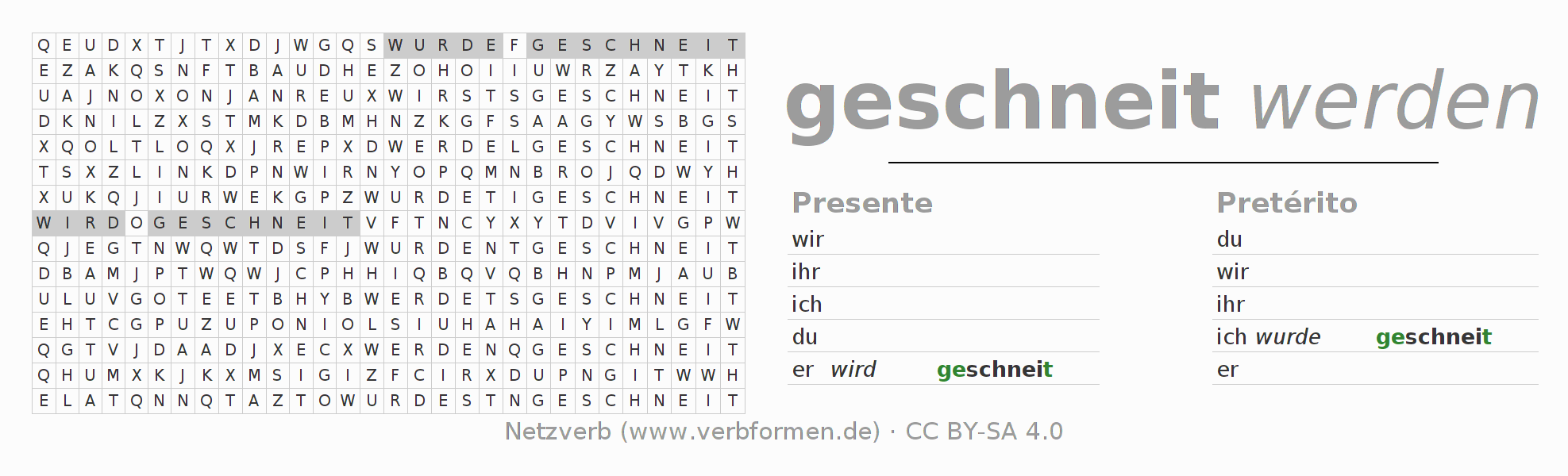 Las hojas de trabajo te ayudan para practicar con la conjugación de los verbos schneien en la escuela o de forma autodidacta. El material de estudio es Open Educational Resources (OER), es decir, libre de licencias CC BY-SA 4.0 y pude ser descargado y utilizado de forma gratuita, por ejemplo para la escuela. Con este fin tenemos para ti varios tipos de hojas de trabajo para los verbos schneien (hat) en forma de tablas de conjugación, acertijos y juegos. Todo el material esta disponible de forma gratuita para descargas PDF, imágenes y paginas web interactivas. Junto con los ejercicios hay innumerables ejemplos schneien que te ayudan en el uso de los verbos.