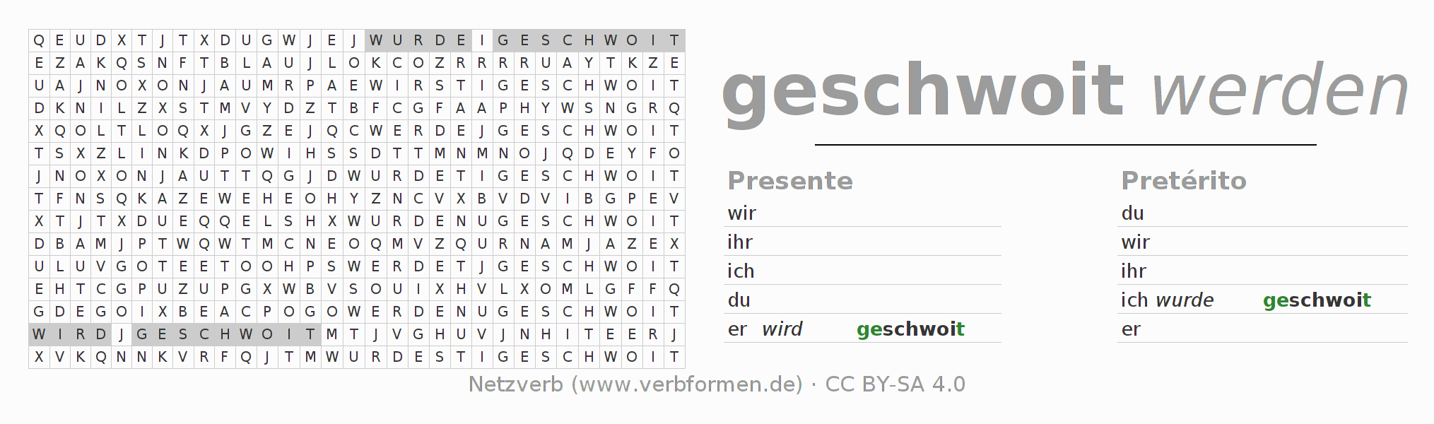 Las hojas de trabajo te ayudan para practicar con la conjugación de los verbos schwoien en la escuela o de forma autodidacta. El material de estudio es Open Educational Resources (OER), es decir, libre de licencias CC BY-SA 4.0 y pude ser descargado y utilizado de forma gratuita, por ejemplo para la escuela. Con este fin tenemos para ti varios tipos de hojas de trabajo para los verbos schwoien en forma de tablas de conjugación, acertijos y juegos. Todo el material esta disponible de forma gratuita para descargas PDF, imágenes y paginas web interactivas. Junto con los ejercicios hay innumerables ejemplos schwoien que te ayudan en el uso de los verbos.