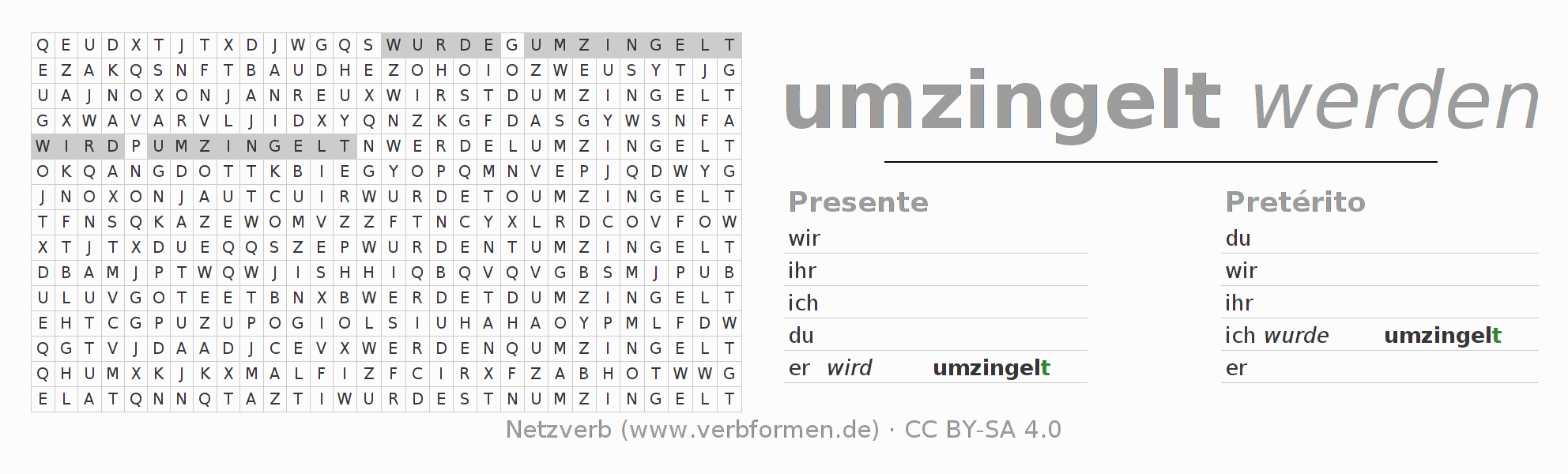 Las hojas de trabajo te ayudan para practicar con la conjugación de los verbos umzingeln en la escuela o de forma autodidacta. El material de estudio es Open Educational Resources (OER), es decir, libre de licencias CC BY-SA 4.0 y pude ser descargado y utilizado de forma gratuita, por ejemplo para la escuela. Con este fin tenemos para ti varios tipos de hojas de trabajo para los verbos umzingeln en forma de tablas de conjugación, acertijos y juegos. Todo el material esta disponible de forma gratuita para descargas PDF, imágenes y paginas web interactivas. Junto con los ejercicios hay innumerables ejemplos umzingeln que te ayudan en el uso de los verbos.