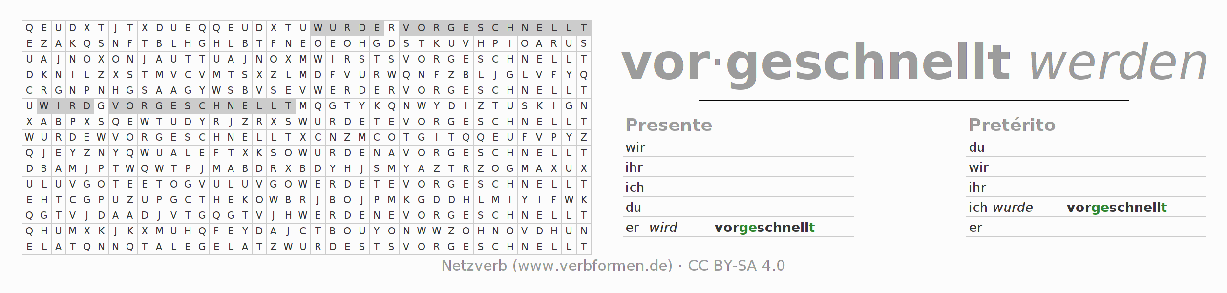 Las hojas de trabajo te ayudan para practicar con la conjugación de los verbos vorschnellen en la escuela o de forma autodidacta. El material de estudio es Open Educational Resources (OER), es decir, libre de licencias CC BY-SA 4.0 y pude ser descargado y utilizado de forma gratuita, por ejemplo para la escuela. Con este fin tenemos para ti varios tipos de hojas de trabajo para los verbos vorschnellen (ist) en forma de tablas de conjugación, acertijos y juegos. Todo el material esta disponible de forma gratuita para descargas PDF, imágenes y paginas web interactivas. Junto con los ejercicios hay innumerables ejemplos vorschnellen que te ayudan en el uso de los verbos.