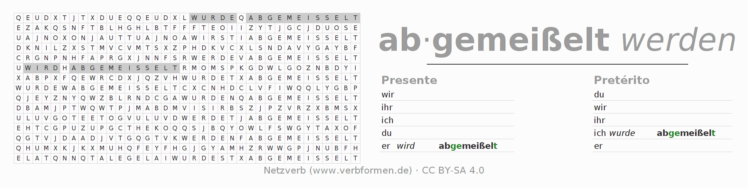 Las hojas de trabajo te ayudan para practicar con la conjugación de los verbos abmeißeln en la escuela o de forma autodidacta. El material de estudio es Open Educational Resources (OER), es decir, libre de licencias CC BY-SA 4.0 y pude ser descargado y utilizado de forma gratuita, por ejemplo para la escuela. Con este fin tenemos para ti varios tipos de hojas de trabajo para los verbos abmeißeln en forma de tablas de conjugación, acertijos y juegos. Todo el material esta disponible de forma gratuita para descargas PDF, imágenes y paginas web interactivas. Junto con los ejercicios hay innumerables ejemplos abmeißeln que te ayudan en el uso de los verbos.