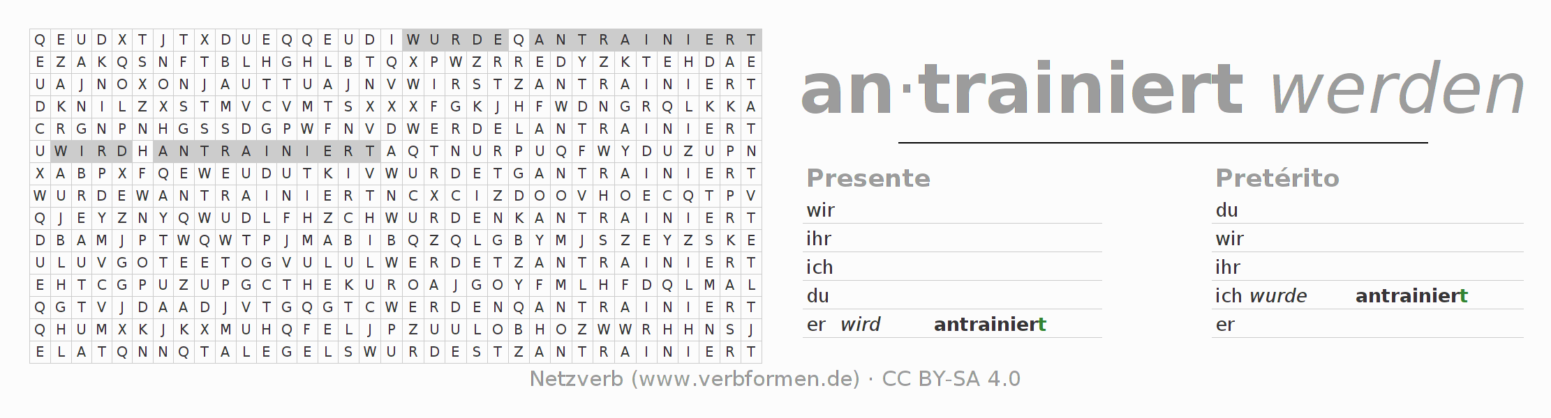 Con este juego de palabras cruzadas puedes aprender de manera desafiante la conjugación del verbo alemán antrainieren.
