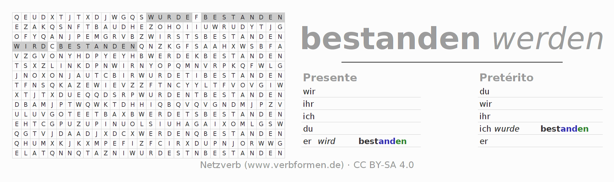 Las hojas de trabajo te ayudan para practicar con la conjugación de los verbos bestehen en la escuela o de forma autodidacta. El material de estudio es Open Educational Resources (OER), es decir, libre de licencias CC BY-SA 4.0 y pude ser descargado y utilizado de forma gratuita, por ejemplo para la escuela. Con este fin tenemos para ti varios tipos de hojas de trabajo para los verbos bestehen en forma de tablas de conjugación, acertijos y juegos. Todo el material esta disponible de forma gratuita para descargas PDF, imágenes y paginas web interactivas. Junto con los ejercicios hay innumerables ejemplos bestehen que te ayudan en el uso de los verbos.